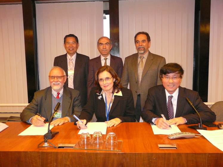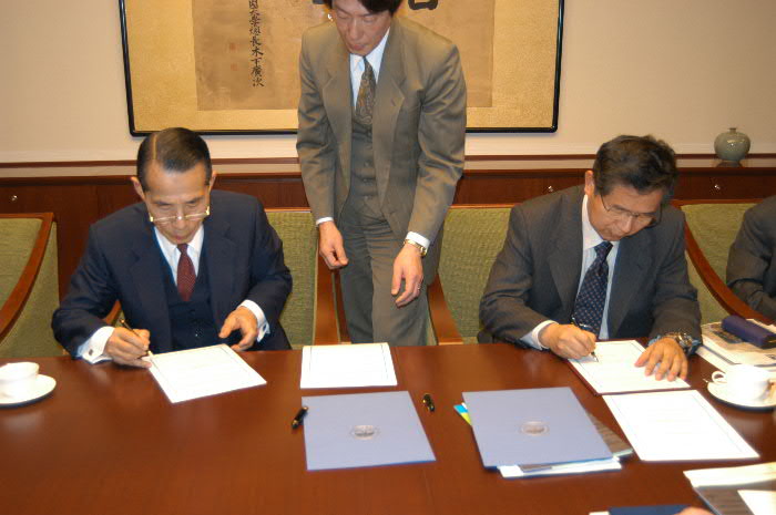 UNESCO represented by its Director-General, Mr Koichiro Matsuura, Kyoto University represented by its President Makoto Nagao, and the International Consortium on Landslides represented by president Kyoji Sassa exchanged the agreement concerning the establishment of a UNITWIN Cooperation Programme on Landslide Risk Mitigation for Society and the Environment Cooperation in the framework of the UNITWIN/UNESCO Chairs Programme. Two from UNESCO, two from Ministry of Education, Culture, Sports, Science and Technology, three vice presidents of ICL joined this signing ceremony held at the President Room of Kyoto University on 19 March 2003.