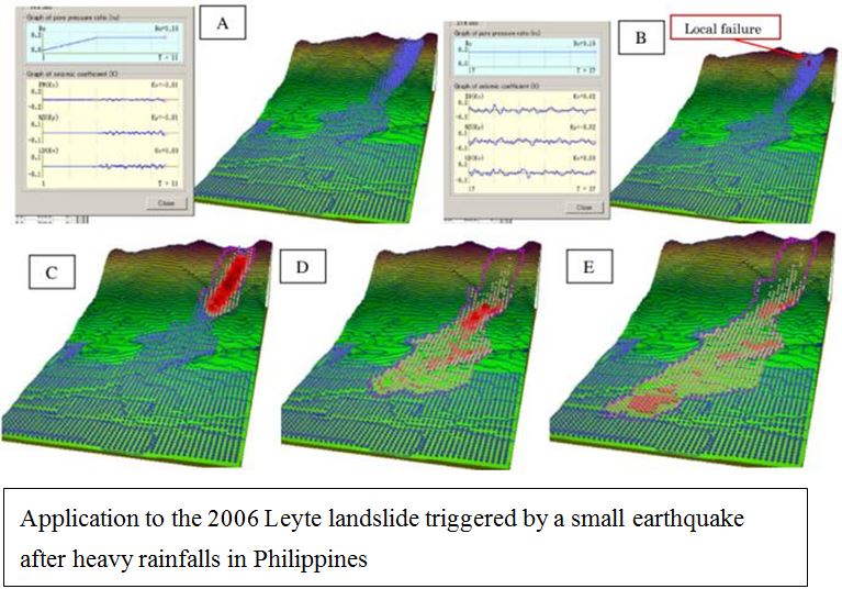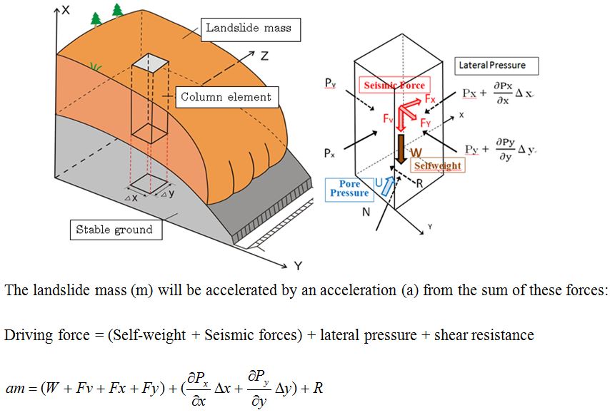 where R includes the effects of forces of N (normal stress due to self-weight W) and U that works in the upward direction of the maximum slope line before motion and in the opposite direction of landslide movement during motion. All stresses and displacements are projected and calculated into the horizontal plane (Sassa 1988). This model was firstly applied to 2006 Leyte Landslide which was triggered by a small nearby earthquake after heavy rainfall and published by Sassa et al. 2010. The left-top box shows the water pressure ratio increased by heavy rainfall and small seismic acceleration loading in three components.