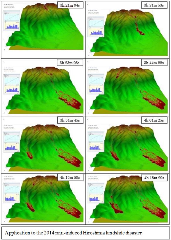 Secondly, the model was revised and applied for 2014 Horoshima rain-induced rapid and long-travelling landslides. In this model, a time vaiation of pore pressure ration calculated by 10 minute-raincall-record was input to the model in stead of earhthquake accelleration recod (for Leyte).