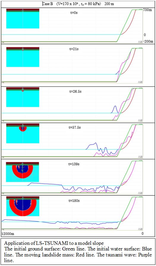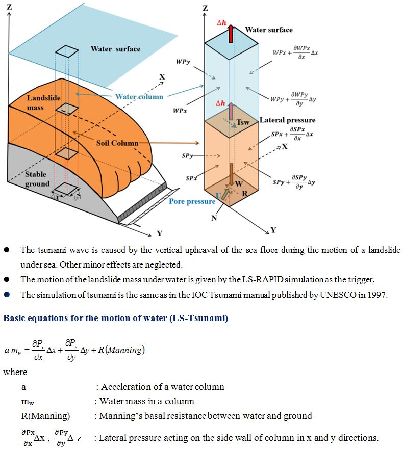 The LS-Tsunami model to simulate landslide-induced tsunami was developed under the following concept. The tsunami wave is caused by the vertical upheaval of the sea floor during the motion of a landslide under sea. The motion of the landslide mass under water is given by the LS-RAPID simulation as the trigger. The simulation of tsunami is the same as in the IOC Tsunami manual published by UNESCO in 1997.