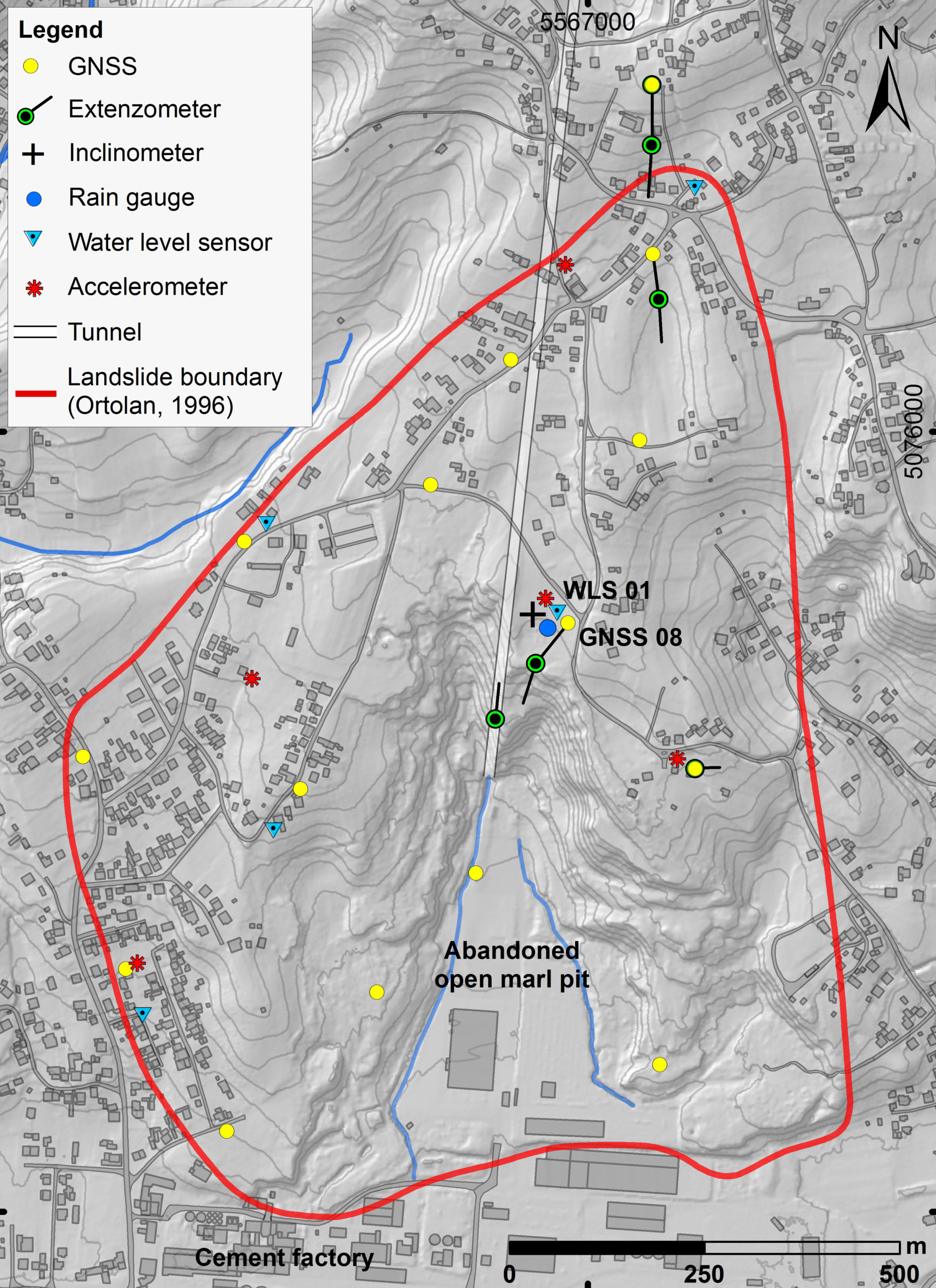 The Kostanjek landslide is the largest landslide in the Republic of Croatia. It is located in the western part of the City of Zagreb, in residential area at the base of the southwestern slope of Mt. Medvednica. The landslide was mainly caused by anthropogenic factors, including mining and excavation in a marl quarry for cement production at the toe part of the landslide and blasting in a limestone quarry placed on the north of the upper part of the landslide. It is a deep-seated large translational landslide formed in soft rock-hard soil, i.e., Pannonian and Sarmatian marls. The landslide extends over an area of approximately 1.2 km2 with a total volume of displaced mass of 32.6 x 106 m3. The maximal depth of the sliding surface is 90 m. Since its activation in 1963, this landslide has caused substantial damage to buildings and infrastructure in the residential zone as well as to factories and commercial buildings. On Kostanjek landslide during the 2011-2013, within the frame of Japanese-Croatian SATREPS FY2008 project ‘Risk Identification and Land-Use Planning for Disaster Mitigation of Landslides and Floods in Croatia’, a monitoring system was established for the purpose of early warning system. The installed monitoring system consists of multiple sensor networks for the measurement of (1) external triggers (a rain gauge, a meteorological station and 7 accelerometers), (2) displacement/deformation/activity (15 GNSS sensors, 7 extensometers, 4 borehole extensometers and an inclinometer), and (3) hydrological properties (3 pore pressure gauges and 5 water level sensors in boreholes and domestic wells, and 2 water level sensors at outflow weirs).