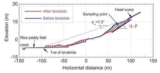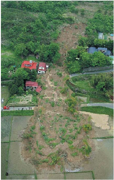 An earthquake with a moment magnitude of 7.0 occurred in northern Japan on May 26, 2003. Landslides were triggered by the earthquake, and among which a massive landslide occurred in the Tsukidate area, northwest of Sendai, the capital city of Miyagi Prefecture. The Tsukidate landslide partially destroyed two houses. Although two people were partially buried by the displaced landslide mass, both were subsequently rescued. The landslide was triggered on a gentle slope with the sliding surface inclination of approximately 13.5 degrees. The displaced landslide mass traveled a long distance of about 130 m, and finally spread and deposited on a horizontal rice paddy, thus showing some typical characteristics of rapid long traveling flow phenomenon. Because this landslide was triggered by an earthquake without rainfall, the fluidization behavior of the landslide attracted the attention of researchers in various fields.